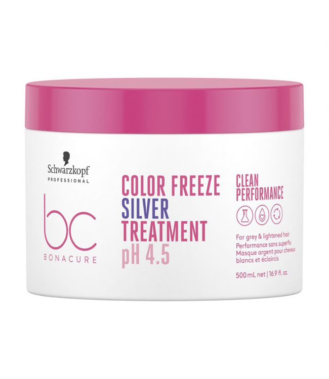 Schwarzkopf Bonacure Color Freeze SILVER Treatment 500ml is een verzorgd haarmasker voor gekleurd haar met paarse pigmenten. Dit haarmasker van Schwarzkopf gaat kleurvervaging tegen bij grijs en opgelicht haar en herstelt het haar intensief. Meer Lezen