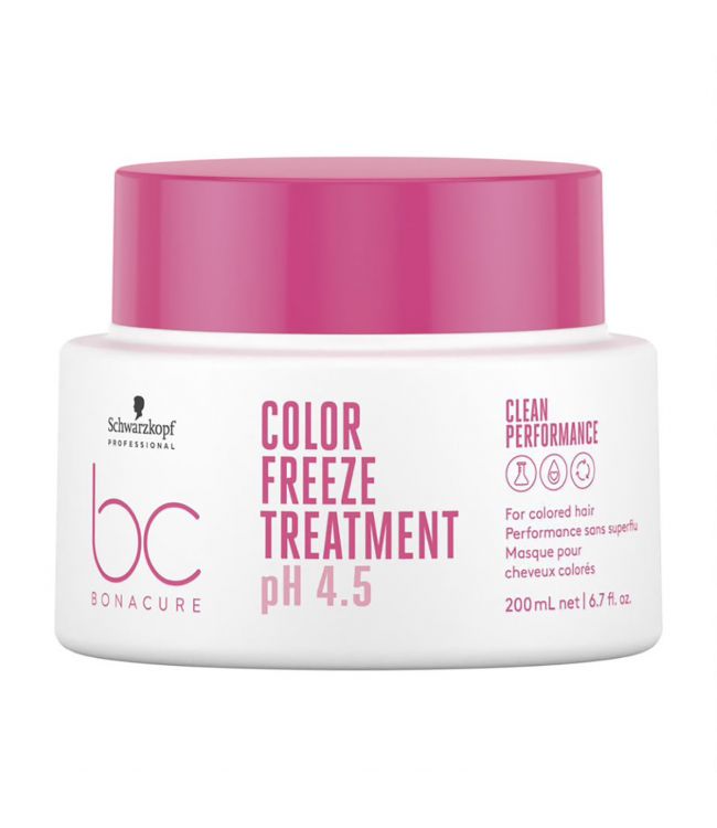 Schwarzkopf Bonacure Color Freeze Treatment 200ml is een verzorgd haarmasker voor gekleurd haar. Dit haarmasker van Schwarzkopf gaat kleurvervaging tegen en herstelt het haar intensief. Color Freeze brengt de haarstructuur in evenwicht tot een optimale pH waarde van 4,5. Dit beschermt de haarkleur en zorgt voor zo min mogelijk kleurvervaging. Een evenwichtige pH-waarde is van het grootste belang om het haar in gezonde conditie te houden. Het haarmasker bevat Vegan Keratine om de natuurlijke elasticiteit en inwendige haarstructuur te verbeteren. Vegan Keratine werkt met 9 aminozuren die de haarstructuur daadwerkelijk herstellen in plaats van enkel opvullen. Het resultaat is versterkt en ontwart haar met een diepe glans.