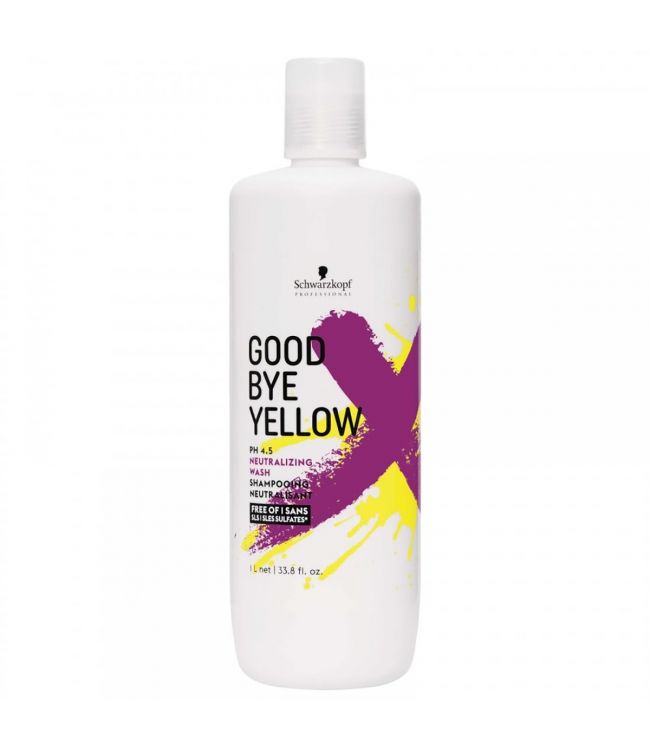 Schwarzkopf Goodbye Yellow Shampoo 1000ml is een zeer sterk-gepigmenteerde anti-yellow shampoo speciaal voor geblondeerd haar. Deze no-yellow shampoo neutraliseert ongewenste gele tinten in blond haar, doordat de shampoo paarse pigmenten bevat. De shampoo heeft een pH-waarde van 4,5, dit zorgt voor een snelle hechting van de kleurpigmenten aan het haar en voor een maximale neutralisatie van ongewenste geeltinten. Schwarzkopf Goodbye Yellow Shampoo is een no yellow shampoo die sulfaatvrij is en speciaal is ontwikeld voor blond, geblondeerd en grijs haar.