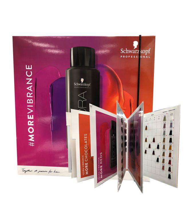 De nieuwste kleurenkaart, met alle Schwarzkopf Igora Vibrance kleuren die in de nieuwe flesjes verpakking zijn uitgebracht. Schwarzkopf Igora Vibrance is een demi-permanente haarkleuring en blijft tot 25 wasbeurten zitten. met de Schwarzkopf Igora Vibrance Kleurenkaart heeft u alle kleuren uit de reeks in één oogopslag op een natuurlijke wijze. Dit maakt het gemakkelijker tijdens een consult met de klant om een keuze te maken.