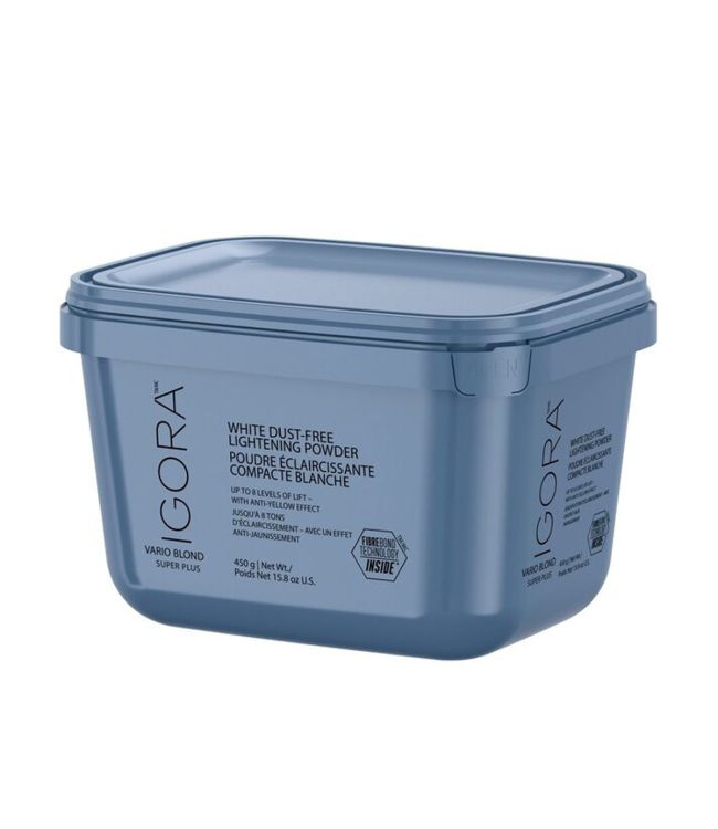 Schwarzkopf Vario Blond Super Plus 450gr is een witte stuifvrije blondeerpoeder voor highlights en volledige blondering. Vario Blond Super Plus licht het haar tot 8 tinten op en bevat Fibre Bond Technologie om haarbruggen in de haarvezels te versterken en haarbreuk drastisch te verminderen. Igora Vario Blond Super Plus maakt een veilige en eenvoudige ontkleuring mogelijk. De ultra krachtige blondering is geschikt voor het oplichten voor alle highlight technieken en toepassingen op het hele hoofd. De blondeerpoeder is stofvrij en wit van kleur. Doordat de poeder wit is geeft het een hoge, maar geen maximale neutralisatie van geeltinten. Het effect is dan ook iets warmer.