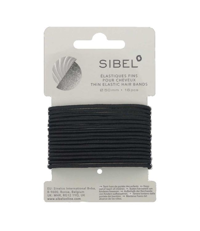 Sibel Elastiekjes Zwart Middel 16st. is een verpakking met daarin 16 smalle, zwarte elastieken. Het elastiek heeft een diameter van 50mm. De elastiekjes hebben geen metalen stukje, waardoor deze minder schadelijk zijn voor het haar.