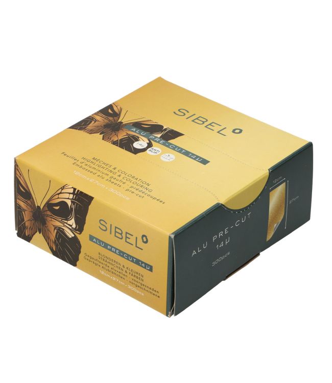 Sibel Folie Aluminium Voorgesneden Goud 27x12cm 14MU Embossed 300st. zijn handige, voorgesneden aluminium vellen in een doos. De folies zijn gegaufreerd voor anti-slip. Het reliëf in de folie geeft extra grip en zorgt ervoor dat de folies niet wegglijden uit het haar. De voorgesneden vellen zijn ideaal voor highlights en haarkleuringen. De folies zijn 12cm bij 27cm bij 14MU dik en zitten in een praktische verpakking met 300 stuks. Het ontwerp is zilver aan de binnenkant en goud aan de buitenkant. Dit geeft een leuk effect in de salon en zorgt voor een moderne klantbeleving.
