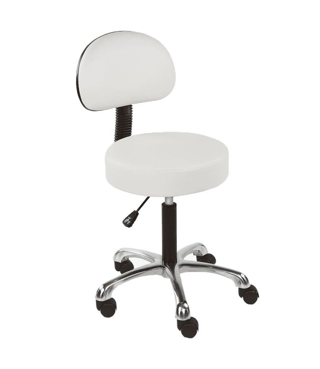 Sibel Kappersfiets Beauty Comfort met Rugleuning Wit is een stijlvolle, ronde kruk op wieltjes. Deze stoel is super comfortabel met een zitgedeelte van 9cm diep van puur schuim. De stoel is bekleed met hoogwaardig PU leer in een witte kleur en voorzien van een verchroomd aluminium onderstel. Meer Lezen