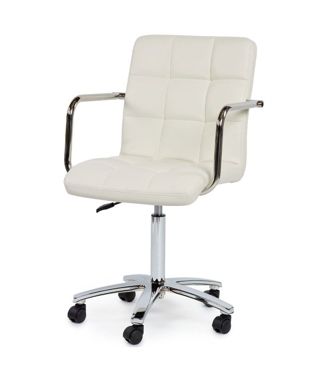Sibel Schoonheidsspecialiste Stoel Femke Wit met Stervoet is een comfortabele, hoogwaardige stoel voor een schoonheidsspecialist, nagelstylist, kapper of klant. De stoel Femke is gemaakt van een extra dikke laag puur, brandwerend schuim met een hoge dichtheid. Dit zorgt voor maximaal en langdurig comfort tijdens het zitten. De stoel is bekleed met hoogwaardige, kwalitatief PU leer in een crème witte kleur en heeft mooie stiksels. De armsteunen en 5-ster voet zijn gemaakt van roestvrij, verchroomd staal en de wieltjes zijn van zwart kunststof. Deze manicure stoel staat garant voor kwaliteit, stijlvol design en comfort in de salon. De stoel heeft een diameter van 60 cm en is in hoogte verstelbaar van 52 tot 72 cm hoog.