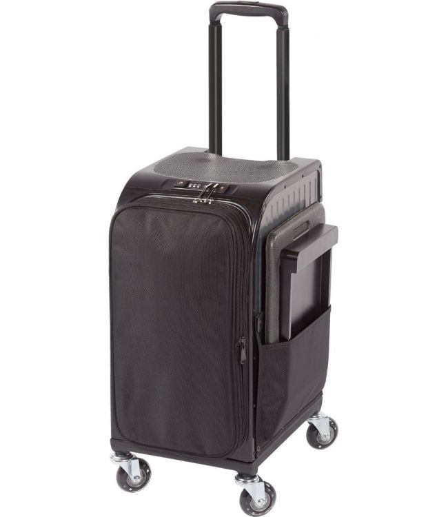 Sibel Stoolcase Rollercoaster Titanium een trolley-koffer die een ware alleskunner is voor de ambulante kapper. Een zeer degelijke ruime koffer, die tevens als kruk en als werkkar te gebruiken is. Gebruik de Sibel ROLLERCOASTER STOOL-CASE TITANIUM ZILVER als kruk en draai geruisloos rond je klant, dankzij de fantastische wielen die haarvrij blijven. Plaats het werkmateriaal op het handige en afneembare werktafeltje tijdens het knippen of kleuren. Verder heeft de koffer één vak aan de zijkant om je spiegel in op te bergen of het werkblad in te stoppen. In de koffer zitten twee scheidingswandjes met klittenband die te verwijderen zijn om de koffer naar eigen wens in te delen. De telescopische hendel kan ingevouwen worden of op hoogte worden gebracht om de koffer wendbaar te maken. Door de 4 wielen is de koffer makkelijk te verplaatsen.