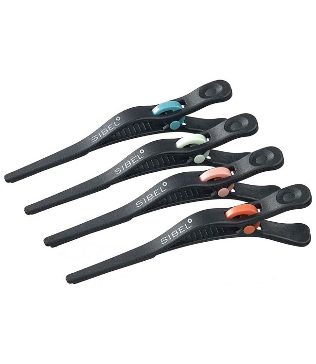 Sibel Verdeelklemmen Zonder Metaal Zwart 4st. 10,5cm zijn niet-metalen clips voor multifunctioneel gebruik in de salon. Deze klemmen zijn ideaal voor het scheiden van het haar tijdens het knippen, kleuren of stylen. Meer Lezen