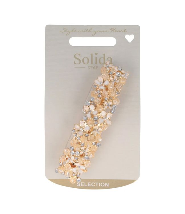 Solida Clip Barrette Goud met Bloemen is een chique haarclip bezaaid met witte bloemtjes, gouden details en strass steentjes. De speld heeft een gouden kleur met details in verschillende formaten. De haarspeld geeft een feestelijke en chique touch aan elke look. De speld is gemakkelijk vast te zetten in het haar een heeft een totale lengte van 8 cm.