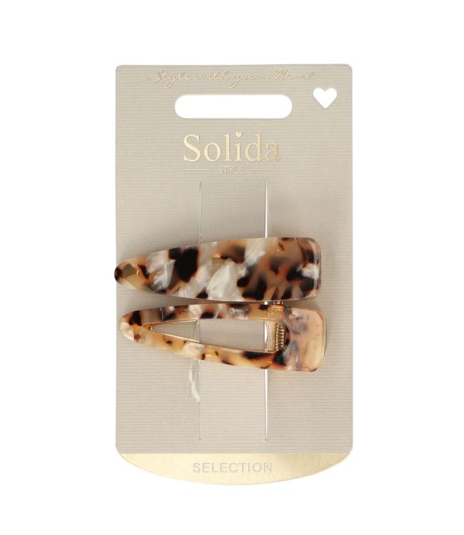 Solida Clips Gevlekt Bruin 2st. is een set van 2 trendy haarclips met unieke print. De haarspelden hebben bruine, beige en parelmoer witte kleuren die samen een marmer patroon vormen met gouden details. Meer Lezen