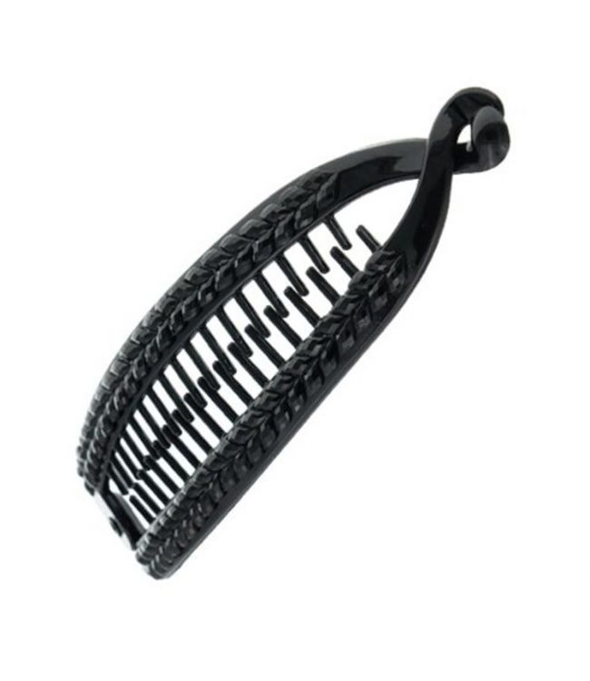 Solida Klem Banaan Zwart is een zwarte bananenklem bewerkt met een lauwerkrans patroon. Deze haarklem kan gemakkelijk gecombineerd worden met verschillende outfits en is toch speciaal door het patroon aan beide zijden. Klem al het haar of een gedeelte van het haar tussen de bananenklem voor een mooie look. De klem is gemaakt van kunststof en ca. 11cm lang.