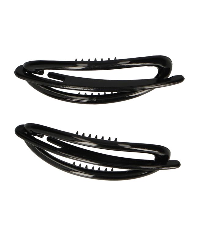 Solida Klem Libelle Zwart 2st. is een set van 2 klemmen in een zwarte kleur. Deze ovalen clip is zeer lichtgewicht en de neutrale kleur is gemakkelijk te combineren. Alle uiteinden van de clip zijn afgerond, waardoor deze comfortabel te dragen is. De libelle klem heeft een totale lengte van 6 centimeter en zit met 2 stuks in de verpakking.