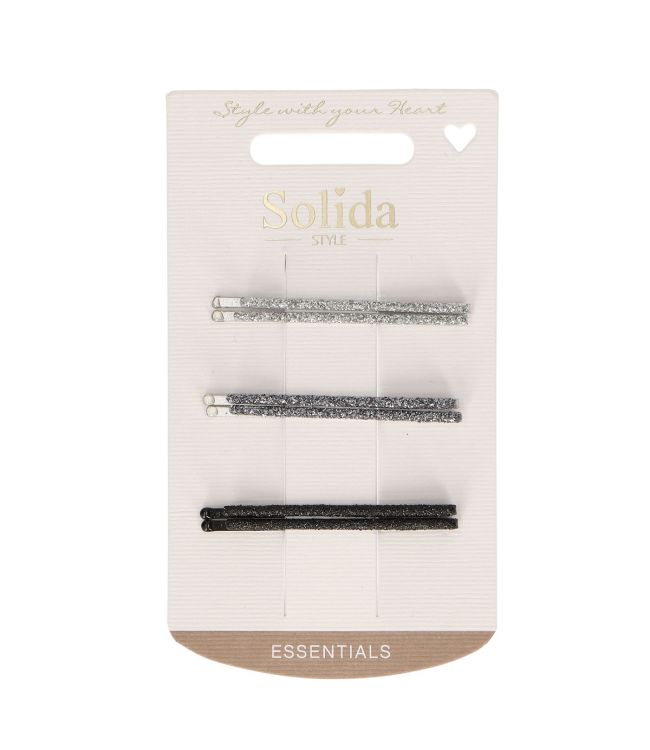 Solida Schuifspeld Multicolor Glitter 6st. is een set met 6 glitter schuifspeldjes in diverse kleuren. De speldjes zijn versierd met prachitge glitters in zilver, antraciet en zwart. De zilveren schuifjes hebben een rond bolletje op het einde dat zacht is voor de hoofdhuid. De glinsteringen van de glitters geven een feestelijke touch aan elke haarlook. De schuifjes zijn 5,5 cm lang.