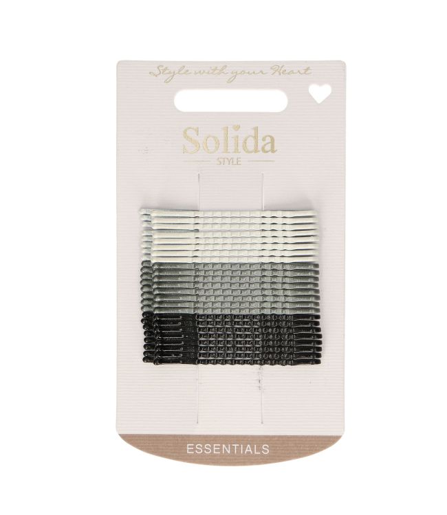 Solida Schuifspeld Wit/Grijs/Zwart 24st. is een set met 24 schuifspeldjes in diverse kleuren. De speldjes zijn wit, zwart en antraciet grijs. De schuifjes hebben een rond bolletje op het einde dat zacht is voor de hoofdhuid. Door het geribbelde oppervlak blijven de speldjes goed in het haar zitten. De schuifjes zijn 5 cm lang.