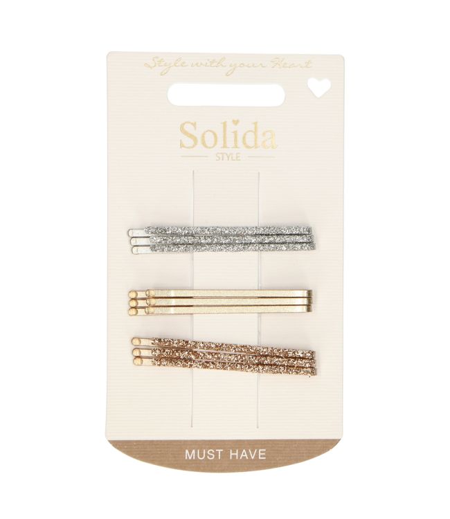 Solida Schuifspeld Zilver/Goud Glitter 9st. is een set met 9 schuifspeldjes in diverse kleuren. De speldjes zijn zilve met glitters, goud en goud met glitters. De schuifjes hebben een rond bolletje op het einde dat zacht is voor de hoofdhuid. Door het geribbelde oppervlak blijven de speldjes goed in het haar zitten. Deze schuifjes met glitters geven elke haarlook direct een feestelijke touch. De schuifjes zijn 5 cm lang.