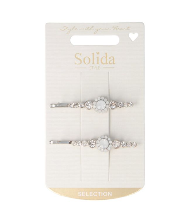 Solida Schuifspelden Zilver Strass 2st. is een set van 2 schuifspeldjes. De speldjes hebben een zilveren kleur en zijn bezaaid met strass rondjes en kleine bloem details van witte steentjes. Meer Lezen