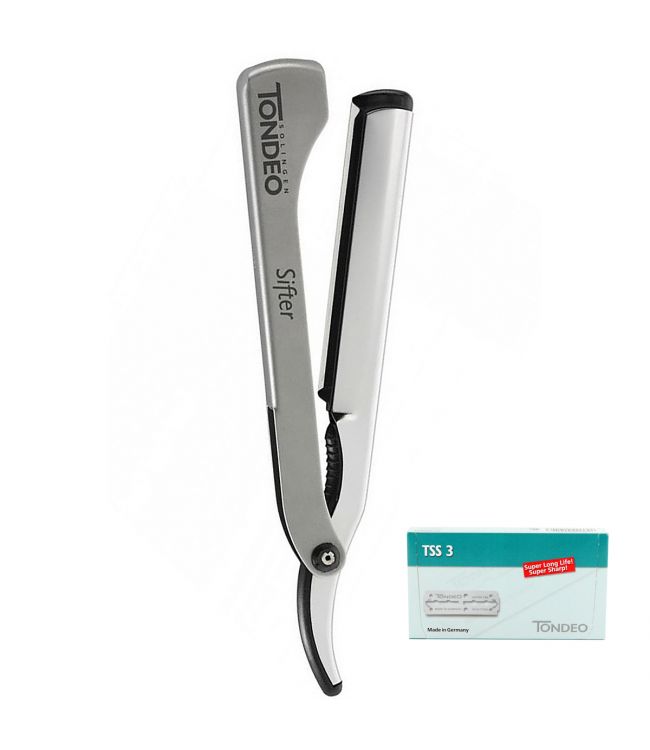 Tondeo Solingen TSS SIFTER Snijmes Inclusief 10 TSS Mesjes is een snijmes met een klapgreep. Dit snijmes werkt zeer aangenaam vanwege de brede messen. Dit snijmes kan gebruikt worden om het haar ui te dunnen, te modelleren of te scheren. De TSS SIFTER kan gebruikt worden met de TSS mesjes die ook meegeleverd worden. Dit snijmes scheert zacht en veilig.