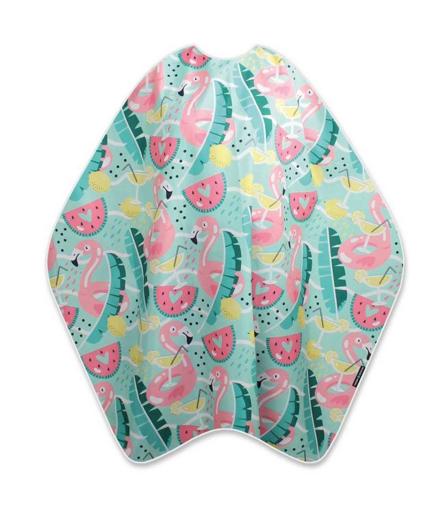 Trend Design Kaplaken Recycape Pink Flamingo 135x150cm is een limited edition kaplaken met zomerse flamingo, watermeloen en citroen print. De RecYcape is gemaakt van 100% gerecycled polyester (RPET). Voor elke cape worden 12 plastic flessen gerecycled. De kapmantel is bijzonder goed ademend en heeft een sluiting met dubbele haak en drukknoopsluiting. Het kaplaken is afneembaar met een vochtige doek en heeft een afmeting van 135 x 150cm. Dit kaplaken is een knipmantel en niet geschikt voor kleuren, verven en/of chemische behandelingen.