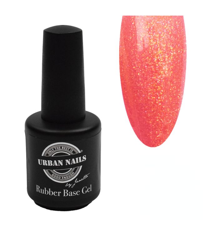 Urban Nails Rubber Base Gel Coral 15ml is een verstevigende basecoat in een koraal roze/rode kleur met gouden glitters. De Rubber Base Gel heeft een uitstekende hechting en is perfect om de natuurlijke nagel op te bouwen en een mooie bolling te realiseren. Net zoals rubber is deze base coat zeer flexibel en stevig voor sterke nagels. De Rubber Base Gel dient uitgehard te worden onder een UV/LED lamp en zorgt voor minimaal 2 weken prachtige resultaten. De gelpolish kan afgeweekt worden met remover of aceton.