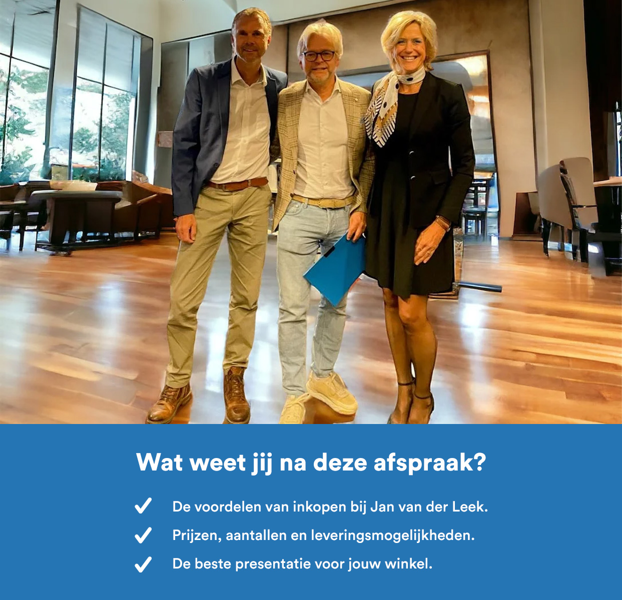 Wat die voordelen zijn? Bij Jan van der Leek geldt vandaag voor 12:00 uur besteld, de volgende dag bezorgd en dit doen wij gratis vanaf €200 ex. btw. Wij zijn er voor de kleine en de grote ondernemer, daarom koop je bij ons per stuk, maar ook in bulk. Ook heeft Jan van der Leek al bijna 100 jaar ervaring in de branche en weten wij exact wat jij als ondernemer nodig hebt. Er zijn nog talloze voordelen te benoemen, dus wil jij meer weten?