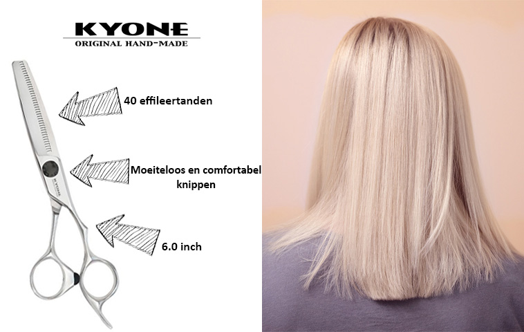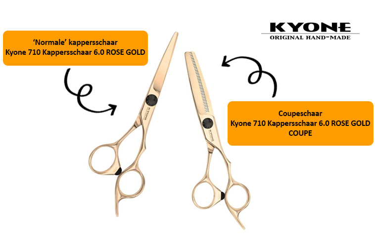 Een effileerschaar wordt gebruikt voor het uitdunnen van het haar. De effileerschaar zoals Kyone 710T Coupeschaar 6.0, heeft aan beide kanten getande snijbladen. Hoe meer effileertanden een effileerschaar heeft, hoe minder het haar kan worden uitgedund en hoe minder tanden een effileerschaar heeft, hoe meer het haar kan worden uitgedund. Effileerscharen worden ook wel coupescharen genoemd. Coupescharen zijn met een ergonomisch en klassiek design beschikbaar. Vaak lanceren merken een set van een coupeschaar en een 'normale' schaar, zodat ze perfect bij elkaar passen. Hieronder staat een voorbeeld. Ben je benieuwd naar deze set? Klik dan op de afbeelding.