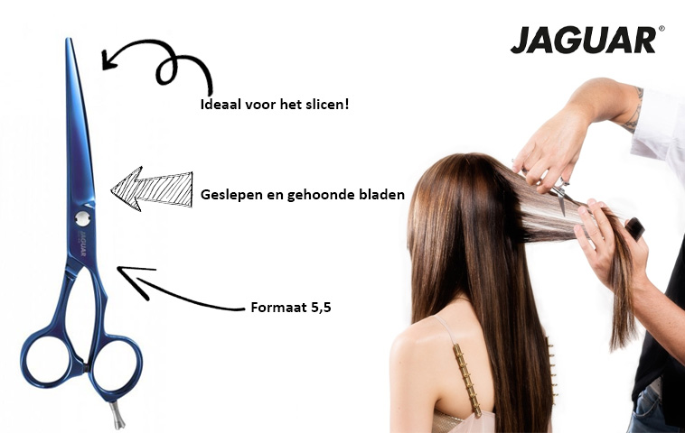 Neem als voorbeeld de Jaguar Solingen JP43 Effileerschaar 6.0. Deze schaar heeft getande bovenbladen en is ideaal voor een ontspannen werkhouding. Hieronder staat een foto van deze goedwerkende schaar.