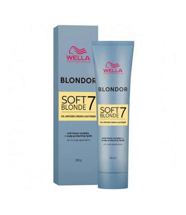 Wella Blondor Soft Blonde Cream 200gr. is een oplichtingscrème voor zachte blondresultaten, speciaal voor applicatie op de hoofdhuid. De crème voorkomt vochtverlies en is milder voor het haar en de hoofdhuid waardoor het zorgt voor minder haaruitval. Met Wella Blondor Soft Blonde Cream kan het haar opgelicht worden tot wel 7 tinten. Wella Blondor Soft Blonde Cream is geschikt voor alle blondeertechnieken, maar speciaal ontwikkeld om dicht op de hoofdhuid aan te brengen. Met ingrediënten als persulfaat en lipide wordt het haar opgelicht en creëert het een coating om het haar heen. Deze coating vormt een beschermlaagje en helpt om vochtverlies tegen te gaan.