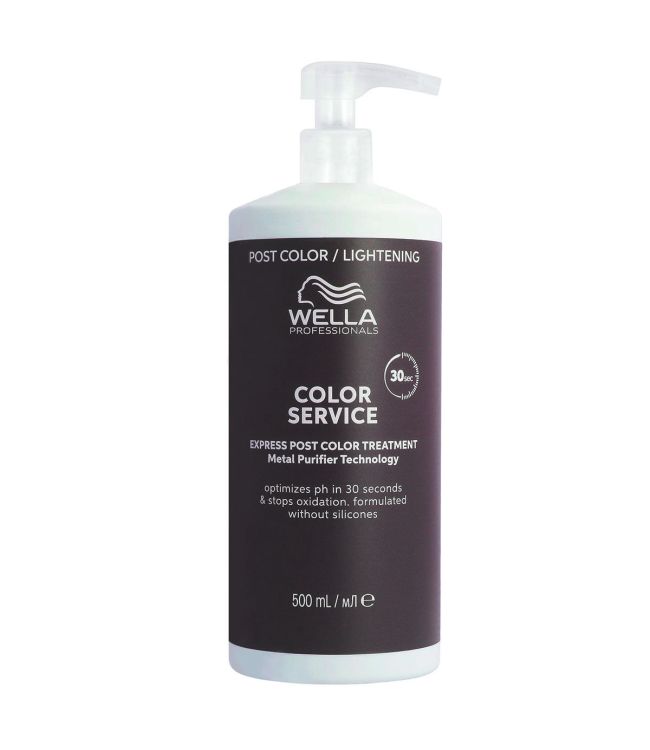 Wella Color Service Express Post Colour Treatment 500ml is een lichtgewicht treatment voor na een kleur- of blondeerservice in de salon. Deze express treatment werkt in slechts 30 seconden om het oxidatie proces te stoppen en de pH-waarde te optimaliseren. De vloeistof helpt om het haar te beschermen tegen schadelijke metalen en verbetert de oxidatieve kleur- en Blondor-blondeer resultaten van Wella Professionals. De Express Post Colour Treatment is verrijkt met Metal Purifier Technology van Wella en is geformuleerd zonder siliconen.