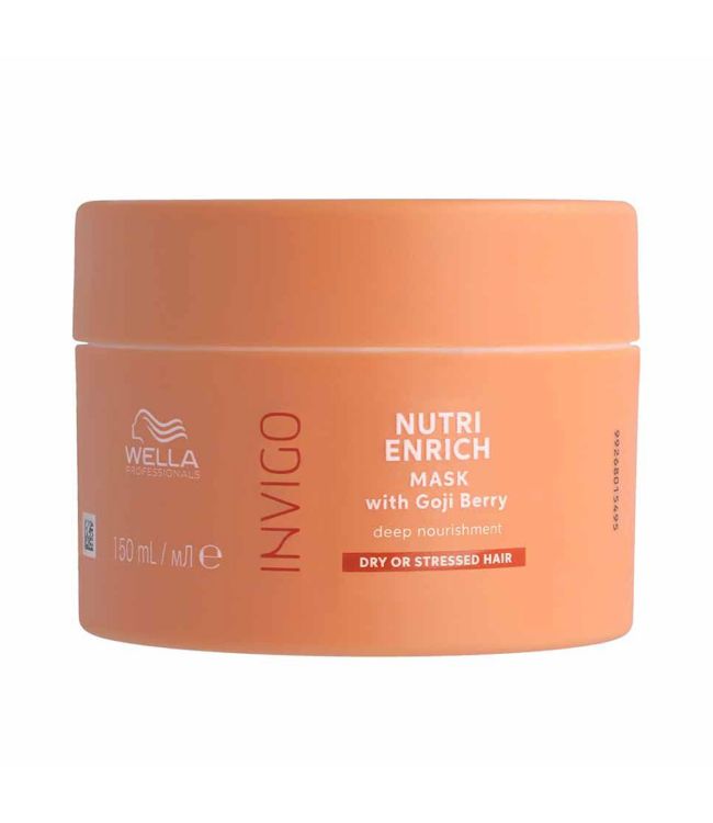 Wella Invigo Nutri Enrich Mask 150ml is een intensief voedend haarmasker voor droog en/of gestrest haar. Het Deep Nourishing Mask met Nutri Enrich Complex herstelt en hydrateert onmiddelijk droog of gestrest haar. Het haar wordt intensief gevoed, pluis wordt getemt en het haar is weer vol vitaliteit. De professionele formule is ontwikkeld om droog en beschadigd haar te voeden en weer glad en vitaal te maken. Het Nutri Enrich Complex bevat Oleic Acid en Panthenol om het haar te hydrateren. Vitamine E beschermt tegen externe stress factoren. Daarnaast is de formule verrijkt met Goji-bessen die bekend staan om hun rijke vitamines, mineralen en peptiden. Wella Nutri Enrich verzorgt het droge en beschadigde haar intensief. Het resultaat is zacht en glad haar dat er weer gezond uit ziet. Het haarmasker geeft het haar een extra verzorgende boost die perfect is als aanvulling op de Nutri Enrich Conditioner.