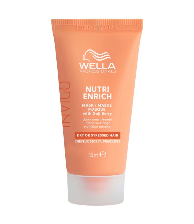 Wella Invigo Nutri Enrich Mask 30ml is een intensief voedend haarmasker voor droog en/of gestrest haar. Het Deep Nourishing Mask met Nutri Enrich Complex herstelt en hydrateert onmiddelijk droog of gestrest haar. Het haar wordt intensief gevoed, pluis wordt getemt en het haar is weer vol vitaliteit. De professionele formule is ontwikkeld om droog en beschadigd haar te voeden en weer glad en vitaal te maken. Het Nutri Enrich Complex bevat Oleic Acid en Panthenol om het haar te hydrateren. Vitamine E beschermt tegen externe stress factoren. Daarnaast is de formule verrijkt met Goji-bessen die bekend staan om hun rijke vitamines, mineralen en peptiden. Wella Nutri Enrich verzorgt het droge en beschadigde haar intensief. Het resultaat is zacht en glad haar dat er weer gezond uit ziet. Het haarmasker geeft het haar een extra verzorgende boost die perfect is als aanvulling op de Nutri Enrich Conditioner. Deze handige mini verpakking van 50ml is ideaal om de shampoo uit te proberen of om hem mee te nemen in de handbagage op reis.