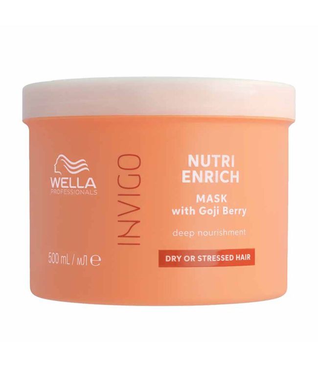 Wella Invigo Nutri Enrich Mask 500ml is een intensief voedend haarmasker voor droog en/of gestrest haar. Het Deep Nourishing Mask met Nutri Enrich Complex herstelt en hydrateert onmiddelijk droog of gestrest haar. Het haar wordt intensief gevoed, pluis wordt getemt en het haar is weer vol vitaliteit. De professionele formule is ontwikkeld om droog en beschadigd haar te voeden en weer glad en vitaal te maken. Het Nutri Enrich Complex bevat Oleic Acid en Panthenol om het haar te hydrateren. Vitamine E beschermt tegen externe stress factoren. Daarnaast is de formule verrijkt met Goji-bessen die bekend staan om hun rijke vitamines, mineralen en peptiden. Wella Nutri Enrich verzorgt het droge en beschadigde haar intensief. Het resultaat is zacht en glad haar dat er weer gezond uit ziet. Het haarmasker geeft het haar een extra verzorgende boost die perfect is als aanvulling op de Nutri Enrich Conditioner.