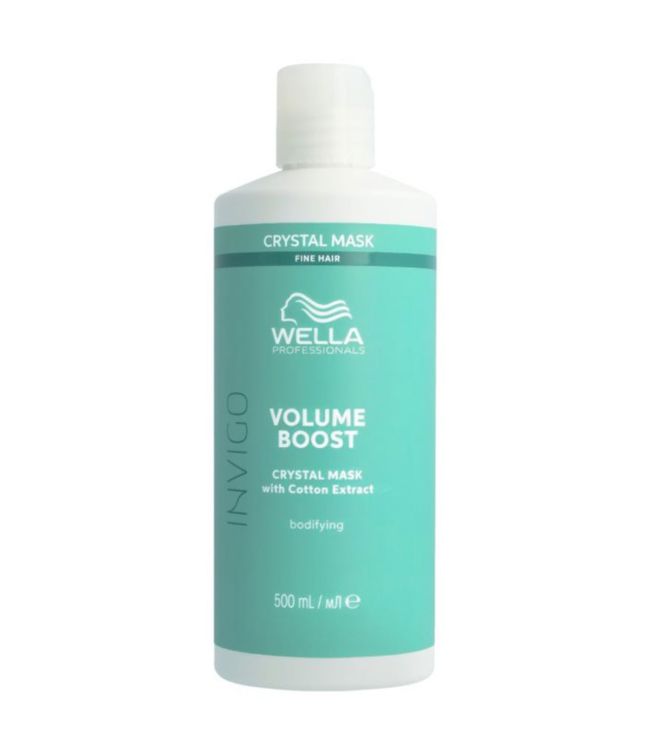 Wella Invigo Volume Boost Crystal Mask 500ml is een transparant gel haarmasker om volume, handelbaarheid en body te geven aan fijn haar. Het haarmasker geeft het fijne haar een extra zachte en lichtgewicht verzorging. Cotton Extract geeft het fijne haar perfecte zachtheid en stabiliteit. Katoen is een zachte, maar stabiele vezel, die zowel stabiliteit en zachtheid kent die nodig is voor volumineus fijn haar. Veerkrachtige polymeren omringen de haarvezel en stabiliseren deze voor volumineuse looks, vooral met een blow-dry. Het haar heeft na gebruik van Wella Invigo Volume Boost nog nooit zo volumineus, licht en handelbaar gevoeld.