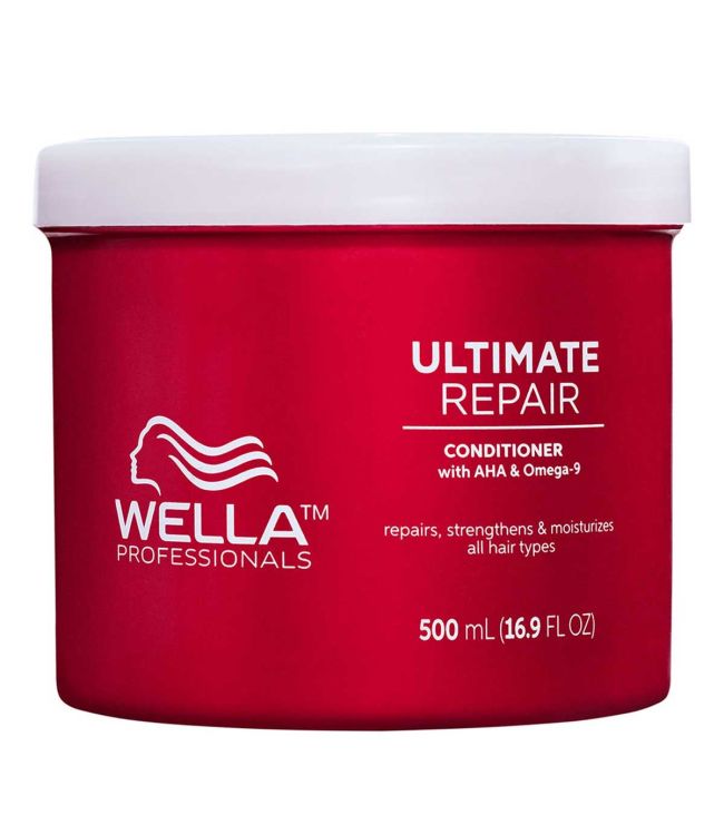 De Ultimate Repair lijn van Wella Professionals is verrijkt met AHA & Omega-9. AHA, oftewel Alfa-hydroxyzuur, is een klein organisch zuur dat diep in de haarvezels door kan dringen. AHA herstelt de waterstofbruggen in de vezellaag voor een sterke haarkern en versterkt haar van binnen uit. Omega-9 voedt de buitenste barrière van het haar. Deze combinatie van ingrediënten herstelt het haar van binnen en verzorgt het haar van buiten. De volledige routine zorgt voor 99% minder haarbreuk, 12x gladder haar en extra glans.