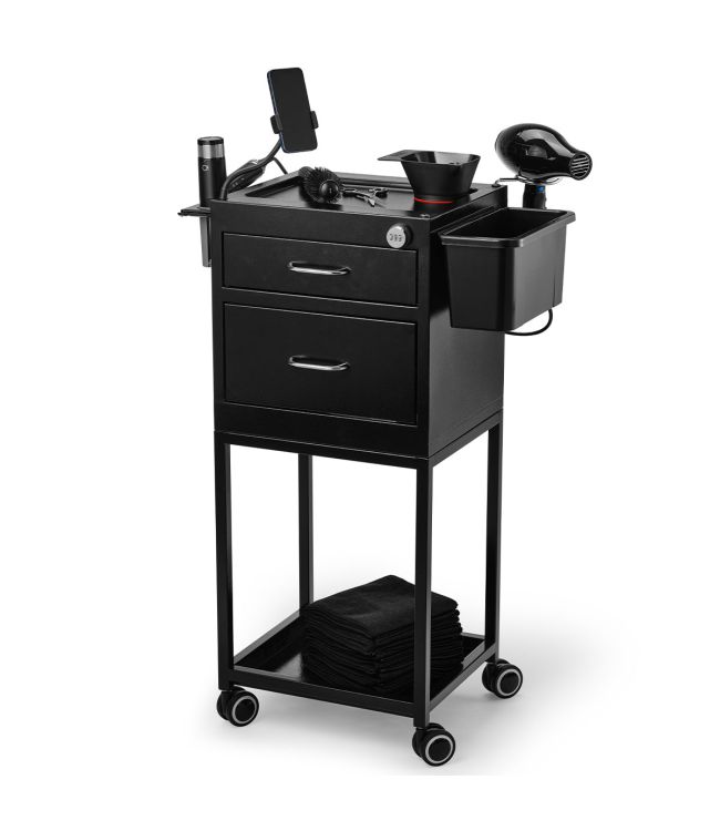Werkwagen Metaal Zwart met Codeslot en 2 Lades is een luxe trolley die handig te gebruiken is tijdens haarbehandelingen. De werkwagen heeft 2 lades, waarvan de bovenste gesloten kan worden met een codeslot. Meer Lezen