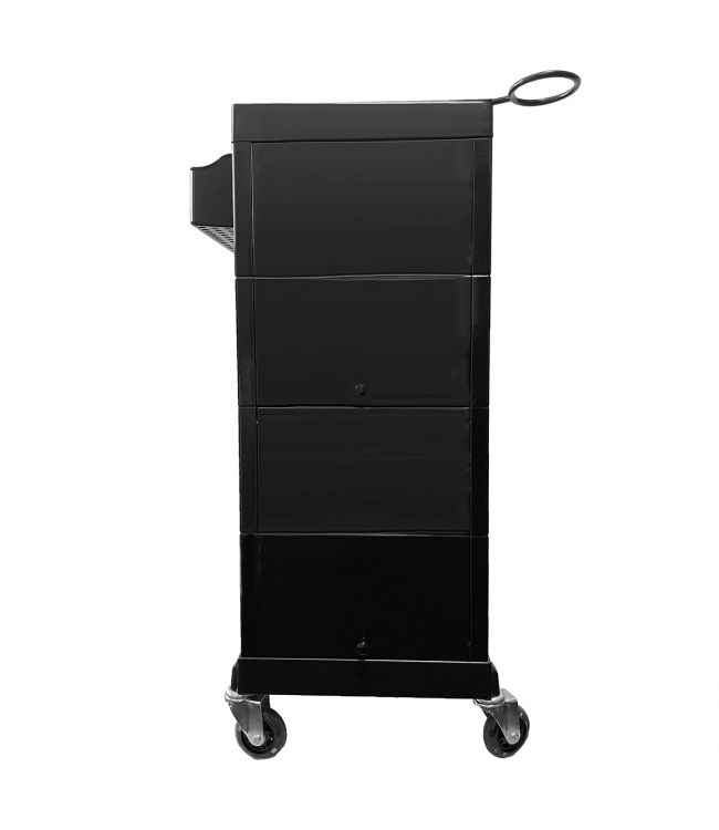 Werkwagen Zwart 4 lades is een werkwagen die handig te gebruiken is tijdens de haarbehandelingen. Deze werkwagen heeft een fohnhouder en 4 lades. De Werkwagen komt in de kleur zwart en is 88.5 cm hoog. De kapperswagen heeft 4 soepele skeelerwieltjes. Door de wieltjes is de wagen gemakkelijk te verplaatsen. Het wagentje is aan alle zijden gesloten, zodat alles netjes opgeboren is. Twee klapdeurtjes aan de voorkant geven toegang tot 4 uitschuifbare lades. Aan de zijkant zit een verwijderbaar rekje voor overige spullen.